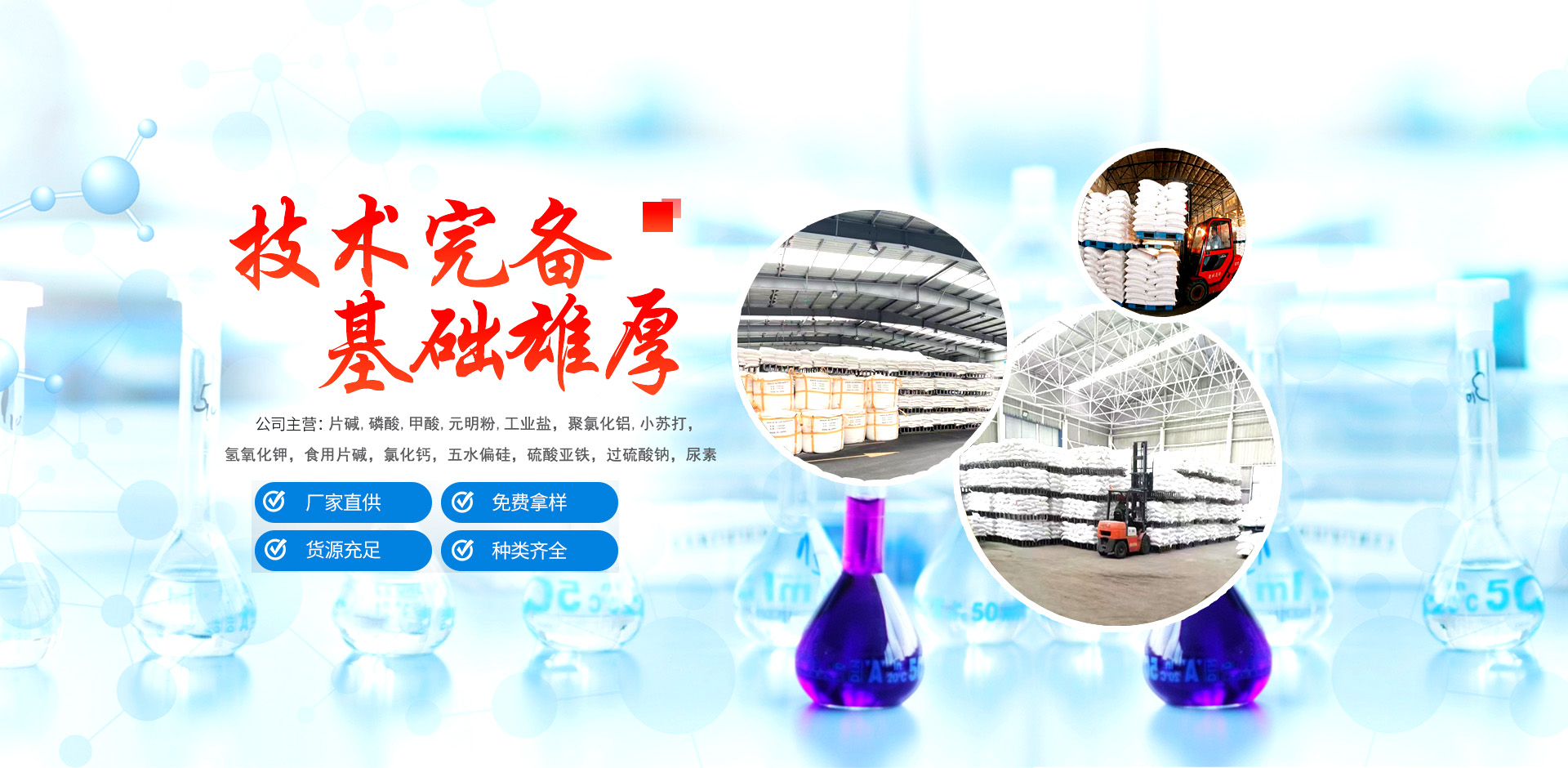 专业从事片碱,纯碱,液碱,32%液碱,50%液碱,磷酸,冰醋酸,次氯酸钠,聚合氯化铝等化工原料